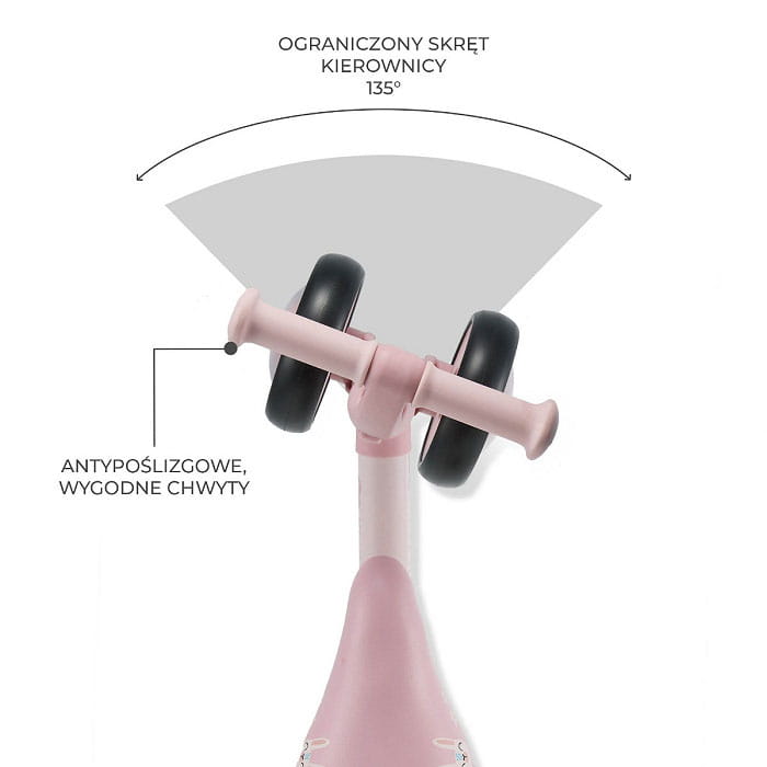 Ten rowerek dziecięcy Kinderkraft został wyposażony w ogranicznik skrętu kierownicy do 135°, który chroni przed nagłymi, niekontrolowanymi ruchami – idealne rozwiązanie na start przygody z jazdą. Ergonomiczne chwyty z miękkiego tworzywa TPR świetnie leżą w małych rączkach, zapewniając pewny, wygodny chwyt i pełną kontrolę na każdym zakręcie.