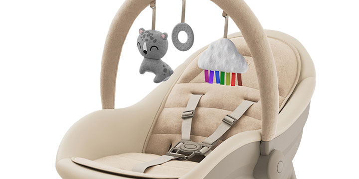 Miękka wkładka stabilizuje ciało noworodka, a dołączony pałąk z trzema zabawkami wspiera rozwój motoryczny i koordynację oko-ręka, dając rodzicom chwilę wytchnienia.