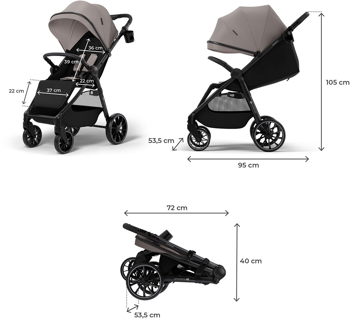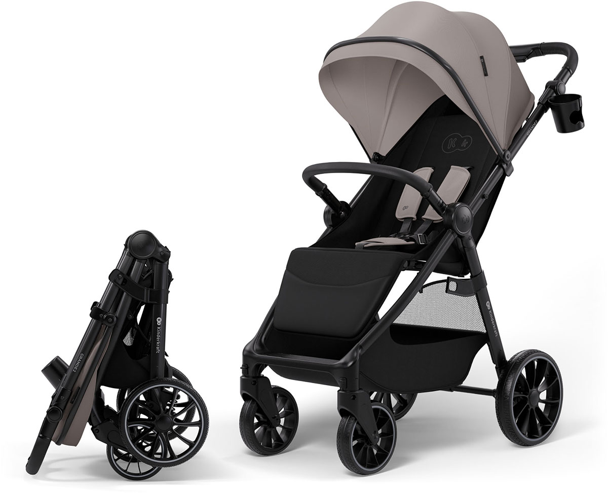 Intuicyjny mechanizm składania jedną ręką pozwala na szybkie przygotowanie konstrukcji do transportu; po złożeniu wózek spacerowy dla dziecka stoi samodzielnie (wymiary po złożeniu to zaledwie 72 × 53,5 × 40 cm).