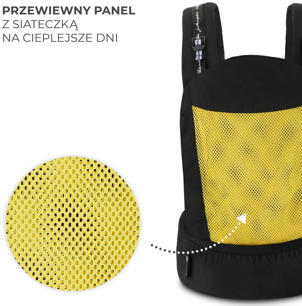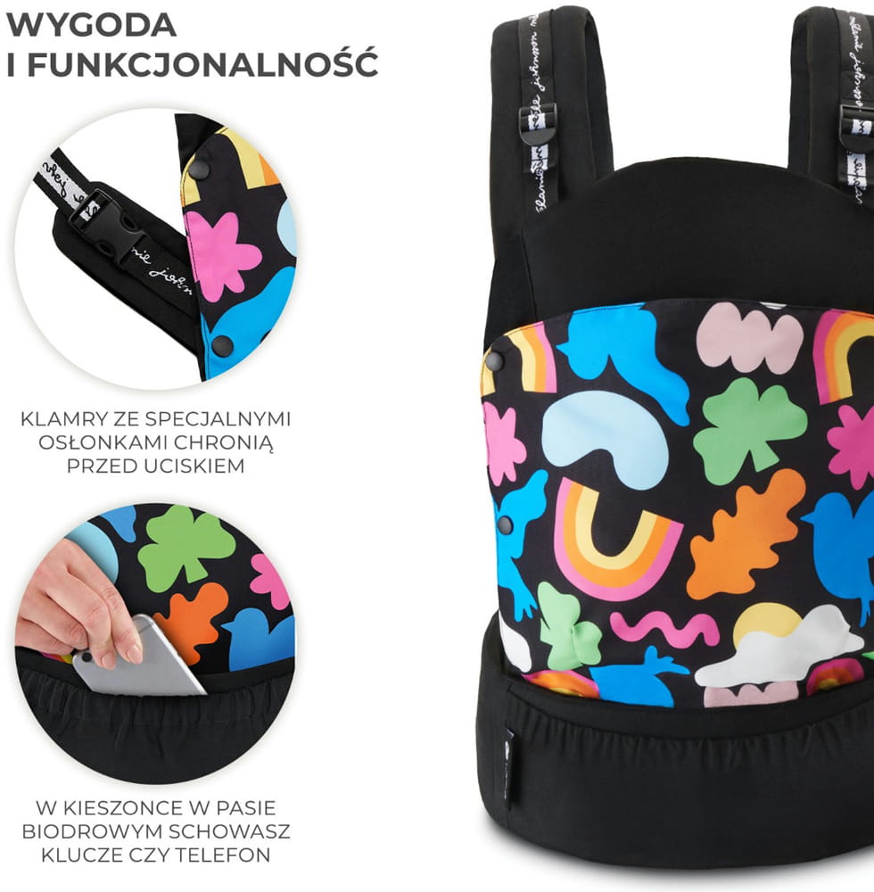 Produkt jest całoroczny - oznacza to, że możemy z niego korzystać niezależnie od pogody. Nosidełko zostało wyposażone w odpinany kapturek, który sprawdzi się podczas deszczu a sam materiał jest szybkoschnący. Huggy posiada także miejsca pokryte siateczką, która dba o odpowiedni przepływ powietrza. Miękkie i oddychające tkaniny dadzą maluchowi poczucie świeżości podczas każdego spaceru.