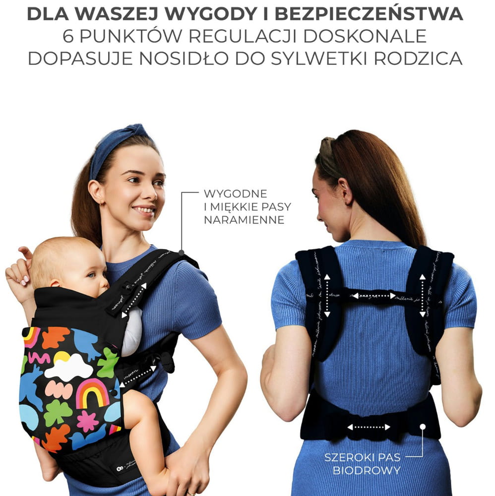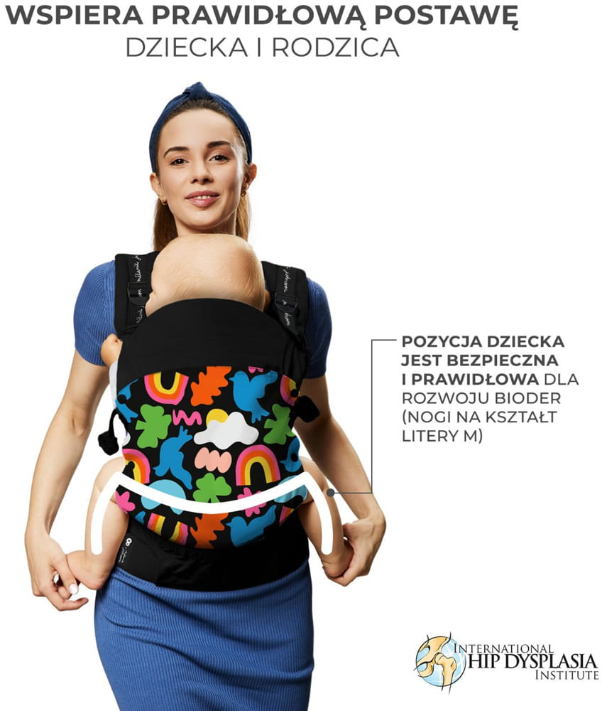 Huggy jest regulowane, dlatego rodzice mogą dzielić jedno nosidełko między sobą i nosić dziecko na zmianę. Co ważniejsze, nosidło zostało zatwierdzone przez Międzynarodowy Instytut Dysplazji Stawów Biodrowych, który jednoznacznie określił oferowany produkt jako zapewniający prawidłową, ergonomiczną pozycję, sprzyjającą rozwojowi każdego maluszka.