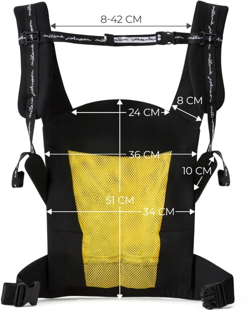Nosidełko możemy dopasować do rodzica oraz do dziecka - dzięki temu mamy pewność najwyższego komfortu i bezpieczeństwa. Pas ściągający został dodatkowo zabezpieczonym wytrzymałym rzepem.