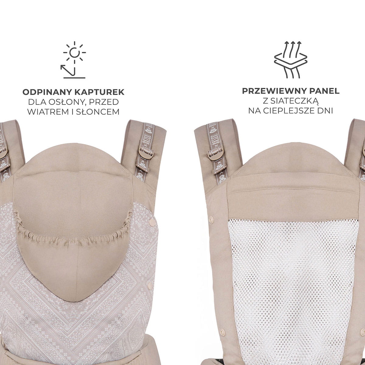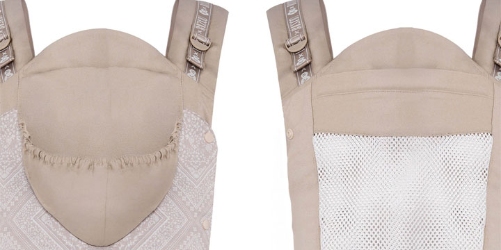Produkt jest całoroczny - oznacza to, że możemy z niego korzystać niezależnie od pogody. Nosidełko zostało wyposażone w odpinany kapturek, który sprawdzi się podczas deszczu a sam materiał jest szybkoschnący. Huggy posiada także miejsca pokryte siateczką, która dba o odpowiedni przepływ powietrza. Miękkie i oddychające tkaniny dadzą maluchowi poczucie świeżości podczas każdego spaceru.