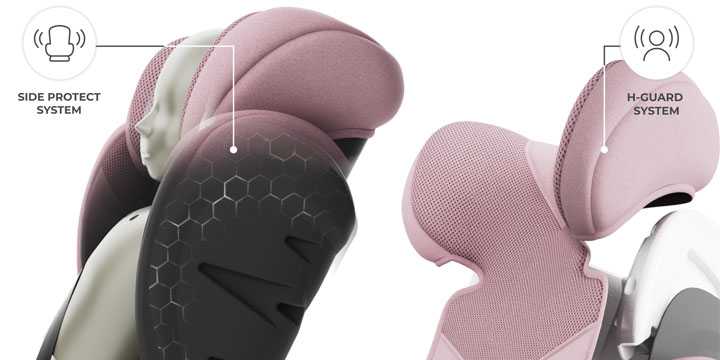 Wzmocniony, 3-warstwowy zagłówek oraz system osłon bocznych (Side Protect System) skutecznie pochłaniają energię uderzenia, chroniąc wrażliwe strefy ciała dziecka podczas kolizji bocznych.