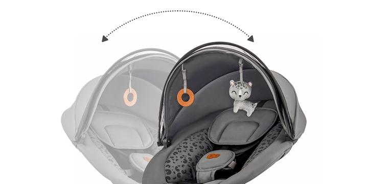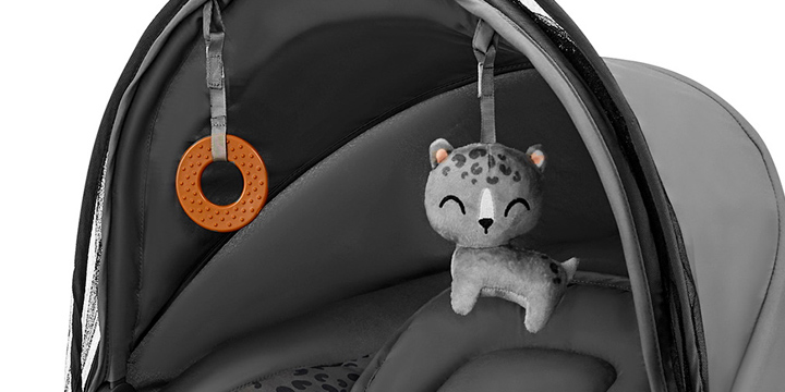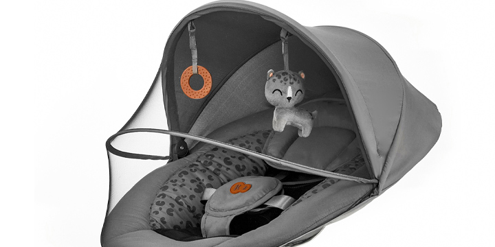 Leżaczek posiada daszek z moskitierą, który pozwoli maluszkowi bezpiecznie odpoczywać na świeżym powietrzu.