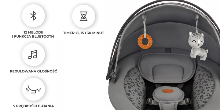 Kinderkraft Lumi 2 jest leżaczkiem ułatwiającym rodzicielstwo. Z jego pomocą łatwiej uśpimy zmęczonego malucha, lub po prostu wydzielimy mu bezpieczne miejsce do zabawy. Leżaczek posiada 12 melodii, 5 prędkości, timer na 8, 15 i 30 minut, a także możliwość włączenia własnej muzyki przez Bluetooth.