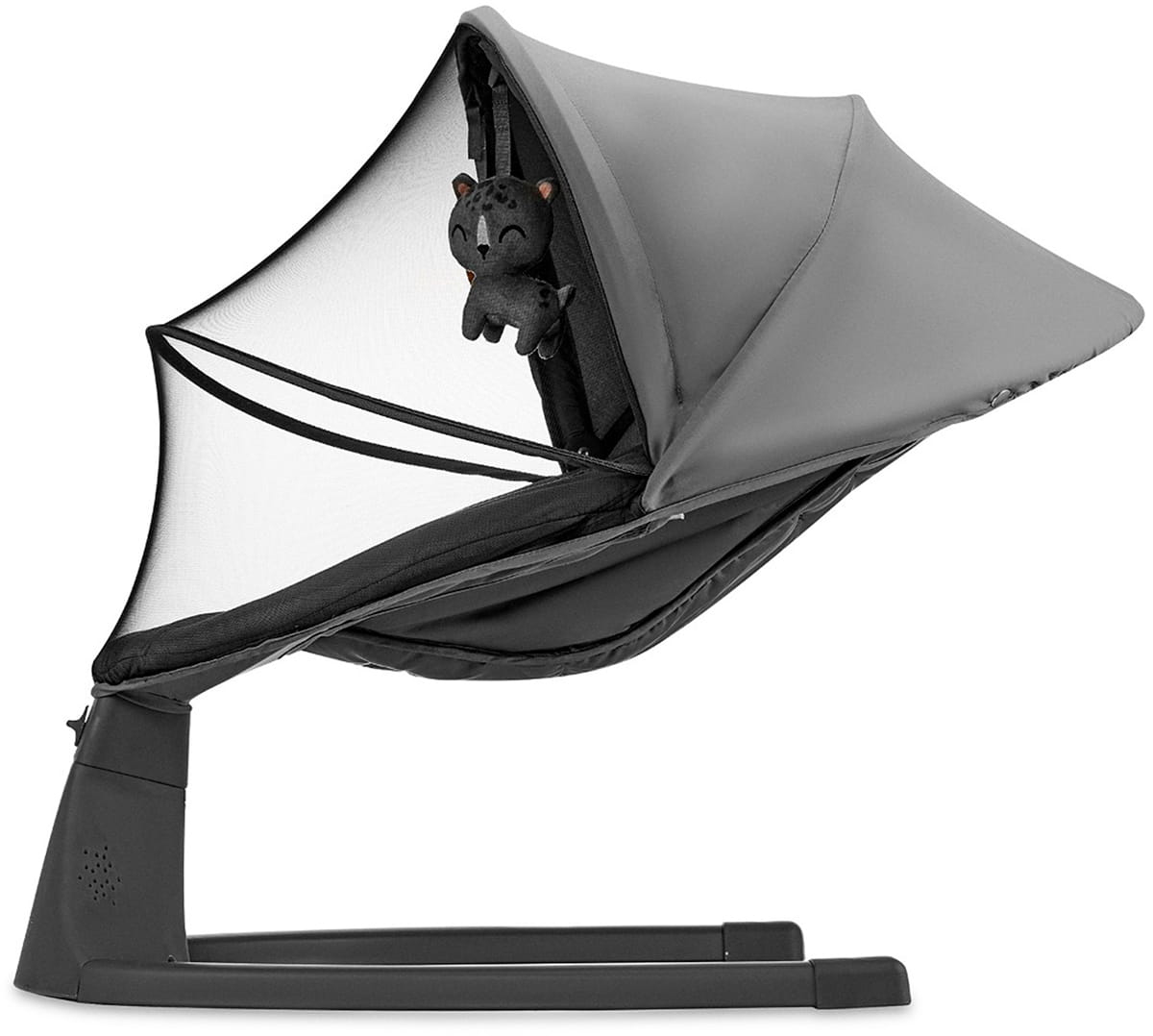 Leżaczek posiada daszek z moskitierą, który pozwoli maluszkowi bezpiecznie odpoczywać na świeżym powietrzu.