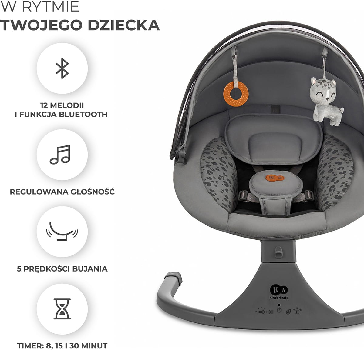 Zabawki w Kinderkraft Lumi 2 zachęcą malucha do wyciągania rączek, co jest świetnym treningiem niemowląt.
