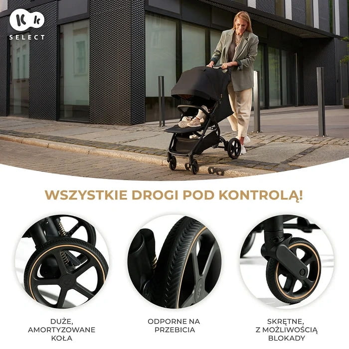 Wózek Mitzy jest wyposażony w duże koła, przednie są skrętne z możliwością blokady oraz amortyzację, co sprawia, że idealnie nadaje się do poruszania po różnorodnym terenie. Bez względu na to, czy spacerujesz po chodnikach miejskich czy szlakach w lesie, wózek zapewnia płynność ruchu i stabilność. Dzięki temu Twoje dziecko będzie komfortowo podróżować, a Ty będziesz mieć pewność, że możesz eksplorować różne środowiska z łatwością i pewnością.