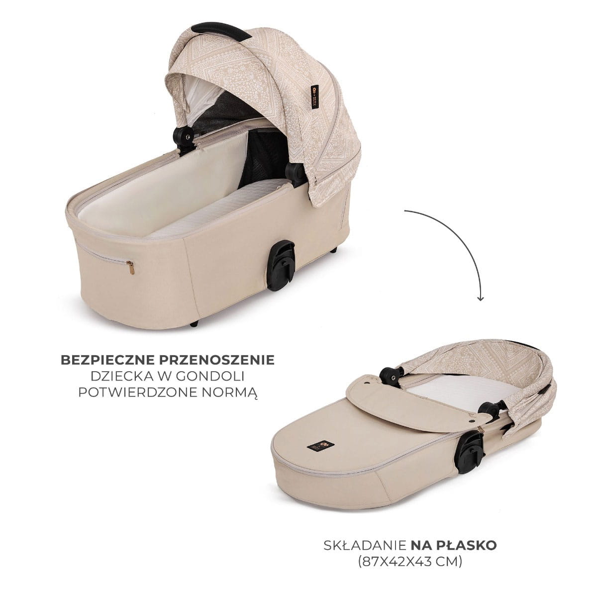 Wygodny transport gondoli zachęci Cię do odkrywania nowych miejsc. Możliwość złożenia tego elementu na płasko pozwoli Ci bezproblemowo zabrać się z maluchem w miejsce oddalone od tych, które już znacie z codziennych spacerów.