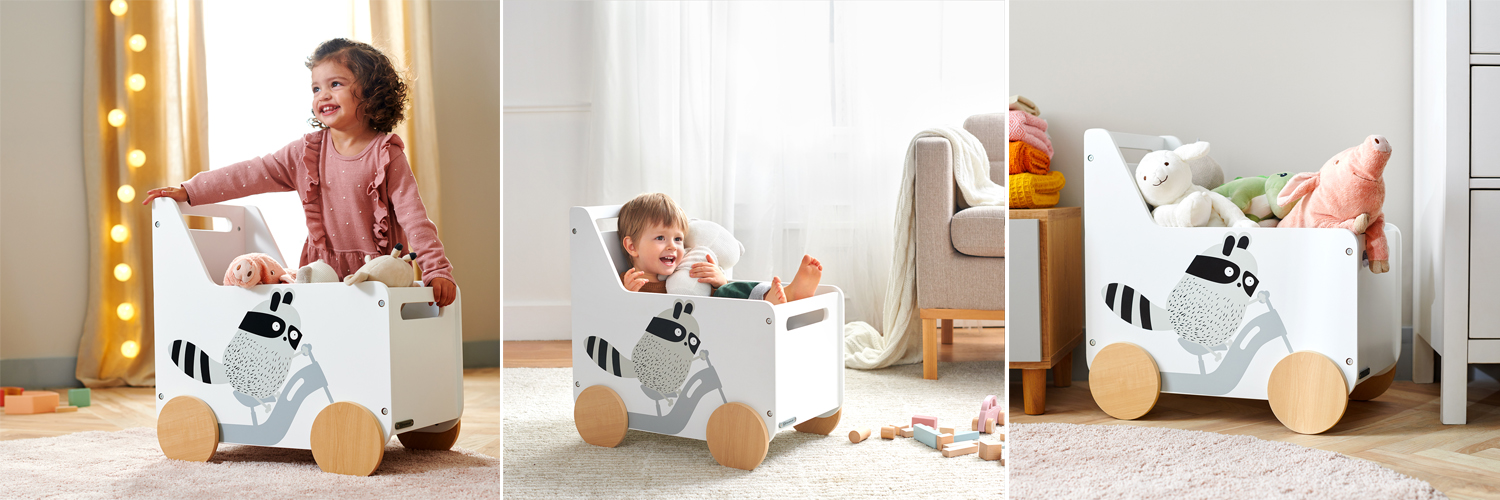 Skrzynia jest niezwykle pojemna, a jej maksymalne obciążenie wynosi aż 20 kg. Dzięki temu, schowamy w niej niejedną zabawkę, ale nie tylko - może służyć też jako produkt do przechowywania pluszaków, kocyków, czy innych drogocennych skarbów. Warto zwrócić uwagę na to, że pomimo możliwości zapakowania wielu przedmiotów, producentowi skrzyni do zabawek Racoon udało się zachować niewielkie wymiary produktu. Dzięki temu mebel znajdzie swoje miejsce nawet w niewielkim pomieszczeniu.