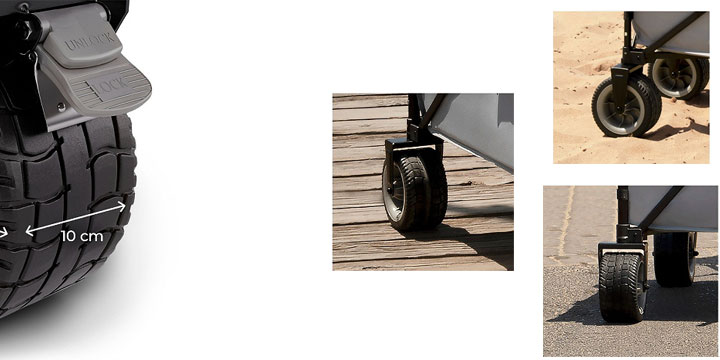 - Duże koła 10 cm - idealne na piasek, trawę i żwir;