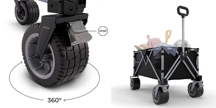 Ten wózek transportowy prowadzi się lekko i intuicyjnie - obrotowe koła zapewniają płynność jazdy, a blokady gwarantują stabilność nawet na trudniejszym podłożu. Regulowana teleskopowa rączka pozwala dopasować wysokość do użytkownika, dzięki czemu wózek wygodnie prowadzi każdy członek rodziny.
