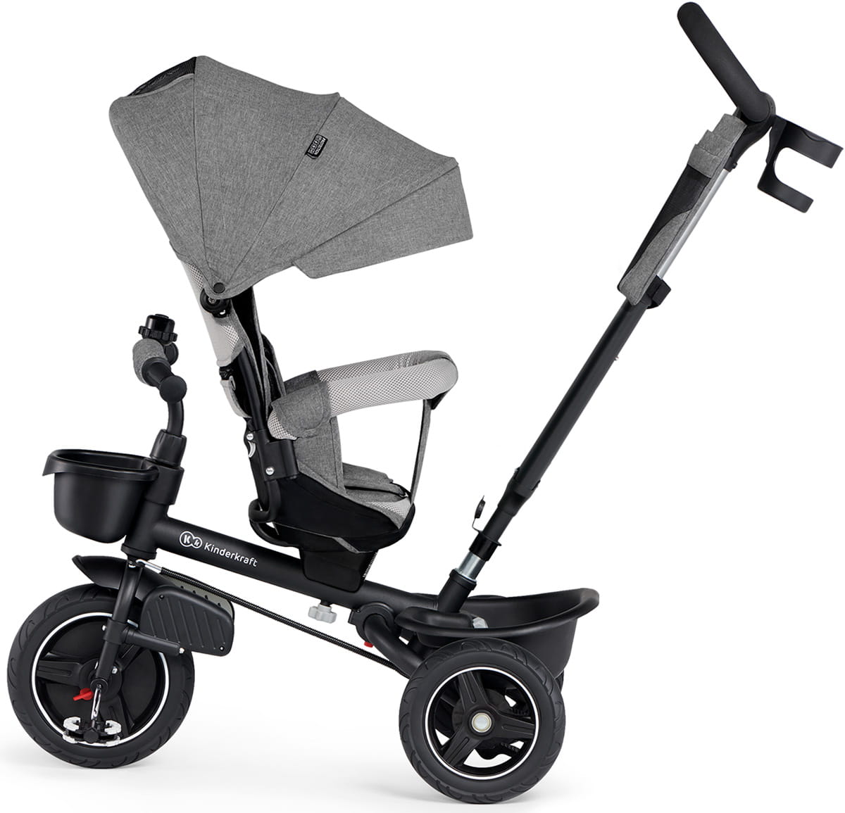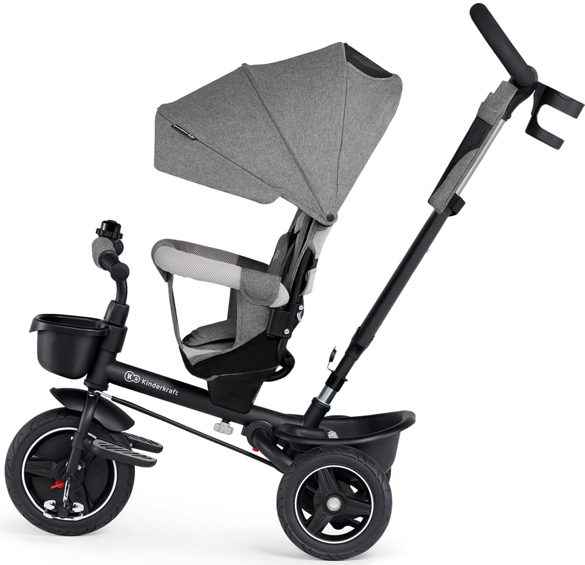 Firma Kinderkraft wyposaża swoje produkty we wszystko co niezbędne, a nawet więcej. W przypadku produktu Spinstep dostajemy łatwy w obsłudze dzwonek, uchwyt na kubek i funkcjonalny materiałowy kosz.