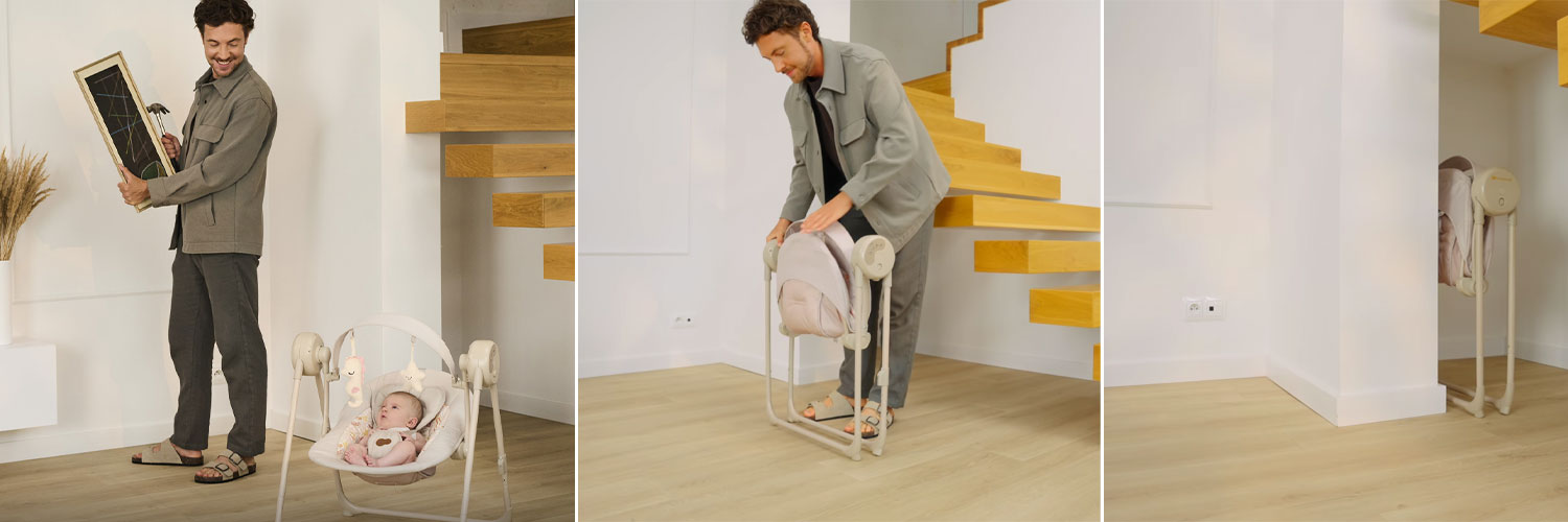 Swingee to praktyczne połączenie leżaczka i bujaczka, które dopasowuje się do potrzeb malucha w ciągu dnia. Może działać jako wygodne miejsce do odpoczynku lub jako elektryczny bujaczek z automatycznym kołysaniem, ułatwiając zasypianie i wyciszenie. Dzięki trzem opcjom zasilania - z sieci, powerbanku lub baterii – sprawdza się zarówno w domu, jak i podczas wyjazdów.