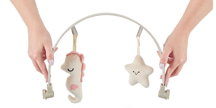 Dołączony pałąk z dwiema miękkimi zabawkami pobudza ciekawość malucha i wspiera rozwój jego zdolności motorycznych. Zabawki zachęcają do wyciągania rączek i chwytania, stymulując zmysły i pomagając ćwiczyć koordynację ruchową już od pierwszych tygodni życia.