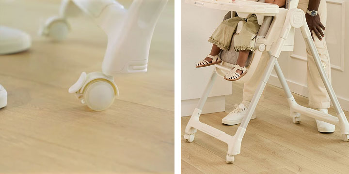 Krzesełko Tulo od Kinderkraft ma cztery wbudowane kółka, które ułatwiają przesuwanie go po mieszkaniu bez wysiłku. Każde kółko wyposażono w niezawodny hamulec, dzięki czemu po ustawieniu krzesełko pozostaje stabilne i bezpieczne w wybranym miejscu.