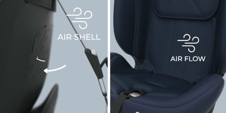 System wentylacji skorupy w połączeniu z oddychającą tapicerką zapewnia ciągłą cyrkulację powietrza. Dzięki temu maluch nie przegrzewa się nawet w upalne dni, a przewiewne wstawki typu mesh sprawiają, że podróż pozostaje komfortowa i higieniczna na każdym dystansie.