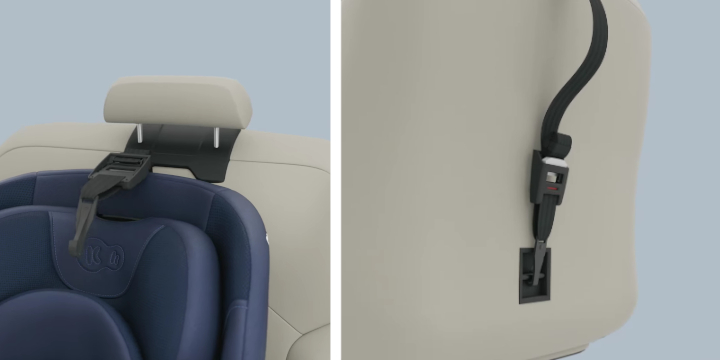 Dodatkowy punkt mocowania w postaci pasa Top Tether z dedykowanym napinaczem zapewnia sztywne połączenie fotelika z kanapą samochodu. Ogranicza to wychylenie konstrukcji podczas gwałtownego hamowania, co jest szczególnie istotne w bezpiecznej konfiguracji tyłem do kierunku jazdy (RWF).