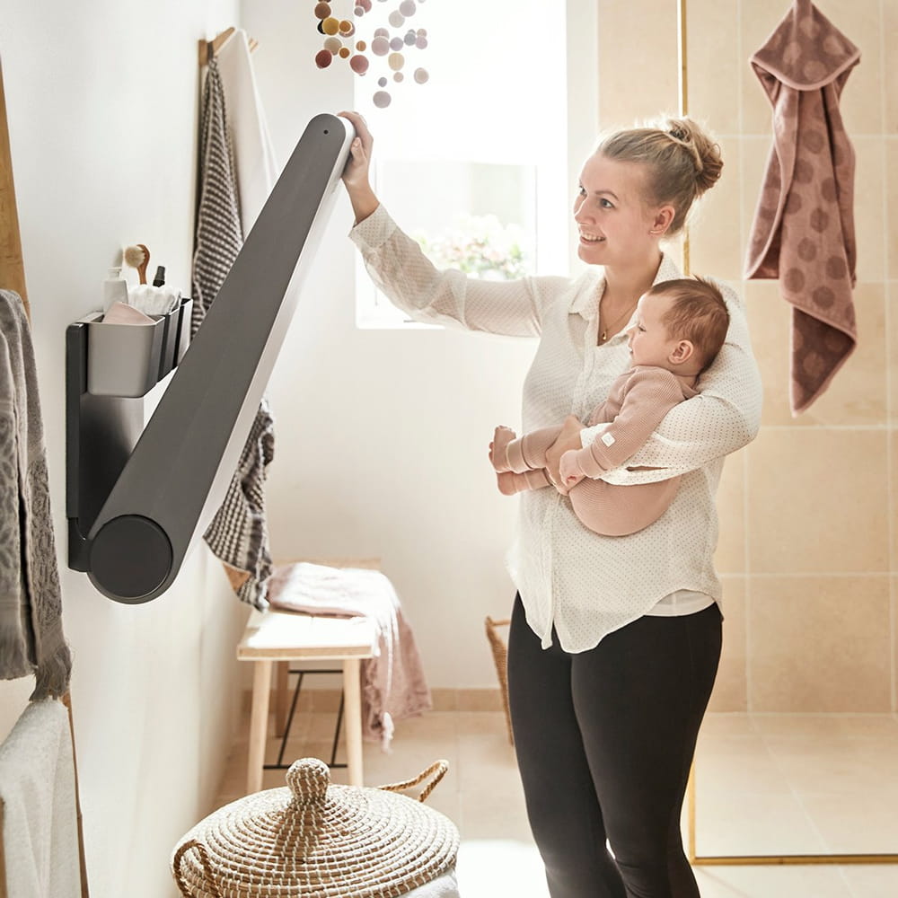 Przewijak Leander Wally™ to nowoczesne rozwiązanie, które oszczędza przestrzeń, montowane bezpośrednio na ścianie. Dzięki swojej konstrukcji i możliwości składania, zajmuje minimalną ilość miejsca, co jest szczególnie ważne w mniejszych pomieszczeniach.