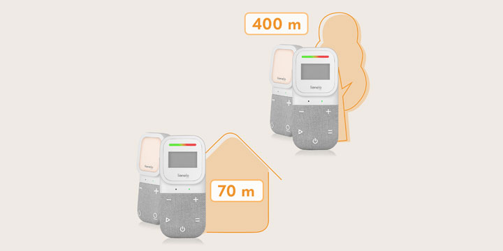 Urządzenie zapewnia stabilne połączenie na odległość do 70 metrów wewnątrz budynków oraz nawet 400 metrów na otwartej przestrzeni. Dzięki temu możesz swobodnie poruszać się po domu czy ogrodzie, zachowując stały kontakt z dzieckiem. W razie utraty sygnału niania automatycznie poinformuje Cię o problemie, abyś mógł natychmiast zareagować.