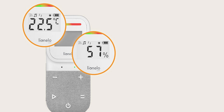 Czytelny, podświetlany ekran sprawia, że obsługa urządzenia jest prosta o każdej porze dnia i nocy. Pokazuje m.in. aktualną temperaturę i poziom wilgotności w pokoju dziecka, co pozwala szybko zadbać o idealne warunki do snu i zabawy.