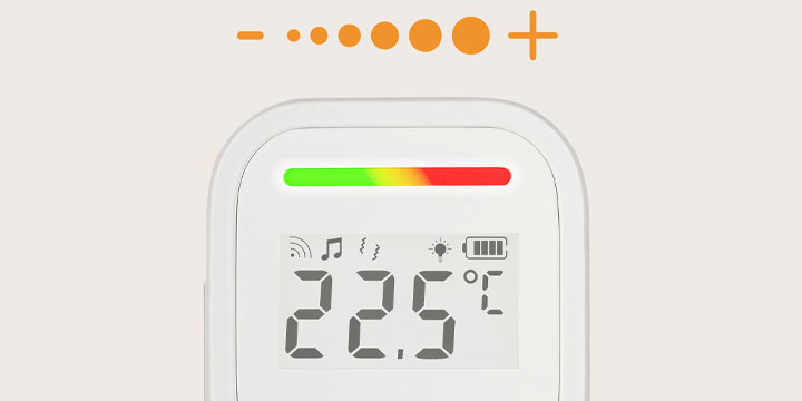Gdy potrzebujesz ciszy, możesz wyciszyć odbiornik, a o odgłosach z pokoju dziecka poinformują Cię diody LED. Zmieniające się kolory pokazują poziom natężenia dźwięku, dzięki czemu wiesz, czy maluch jest spokojny, czy właśnie głośno domaga się uwagi.
