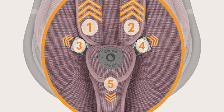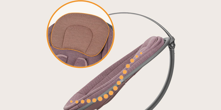 Wbudowane pasy 5-punktowe utrzymują dziecko w stabilnej i bezpiecznej pozycji, nawet podczas intensywniejszego kołysania. Zostały wykonane z gładkiego, łatwego do czyszczenia nylonu, a miękkie osłonki i poduszki chronią wrażliwą skórę maluszka przed uciskiem i otarciami – bo komfort i bezpieczeństwo mogą iść w parze.