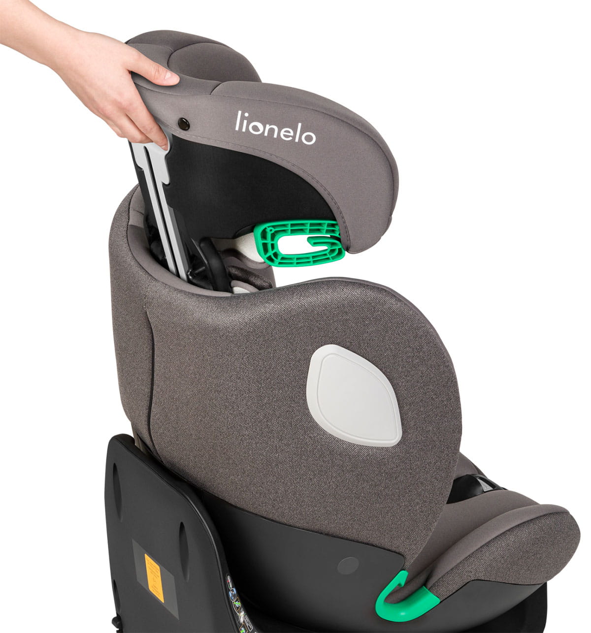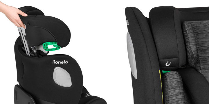 14-stopniowa regulacja wysokości zagłówka pozwala fotelikowi rosnąć razem z dzieckiem. Zagłówek reguluje się jednocześnie z pasami bezpieczeństwa. Technologia Tri-Guard w zagłówku fotelika Lionelo Braam i-Size ochrania głowę dziecka poprzez zastosowanie aż trzech różnych warstw, w tym jednej ze styropianu EPS oraz pianki z funkcją pamięci Memory Foam. Tak skonstruowany zagłówek absorbuje siłę uderzenia podczas wypadku.