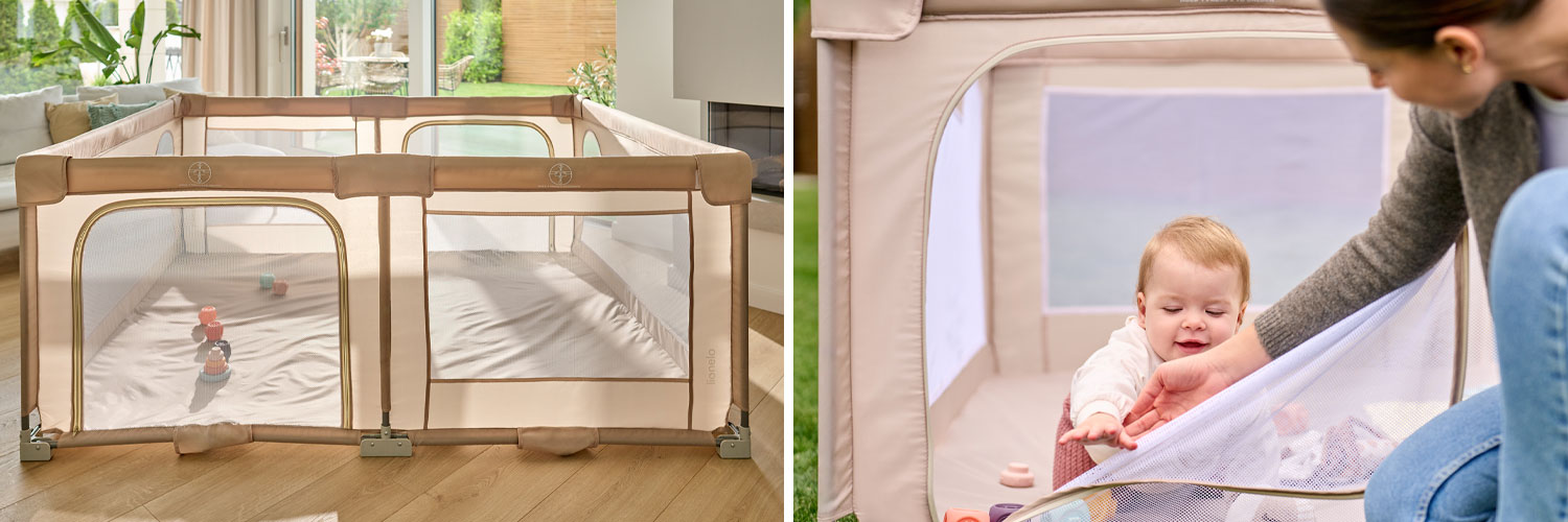 Kojec z bocznymi wejściami na suwak pozwala starszym dzieciom samodzielnie wchodzić i wychodzić z kojca. To praktyczne rozwiązanie uczy je niezależności i daje poczucie swobody. Zamki są proste w obsłudze i w pełni bezpieczne dla malucha.