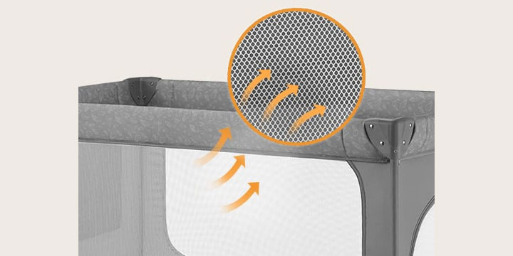 Boki z siatki sprawiają, że powietrze swobodnie przepływa przez konstrukcję łóżeczka jednocześnie niwelując gromadzenie się wilgoci. Co wiecej, dzięki dobrej widoczności możesz stale obserwować maluszka bawiącego się w łóżeczku.