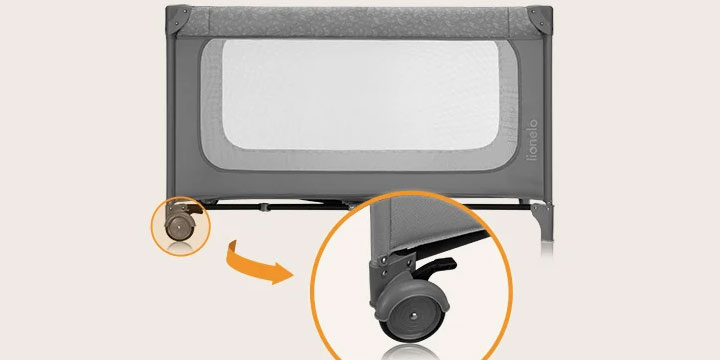 Łóżeczko turystyczne Lionelo Jasmin posiada dwa kółka z hamulcami - dzięki nim możesz wygodnie przesuwać łóżeczko, lub przemieszczać się z nim pomiędzy pomieszczeniami.
