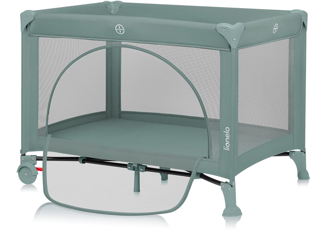 Boki z siateczki umożliwiają utrzymywanie kontaktu wzrokowego między dzieckiem a rodzicem oraz zapewniają odpowiednią cyrkulację powietrza. Wejście umieszczono na dłuższym boku łóżeczka, co zwiększa wygodę dziecka przy wchodzeniu i wychodzeniu.