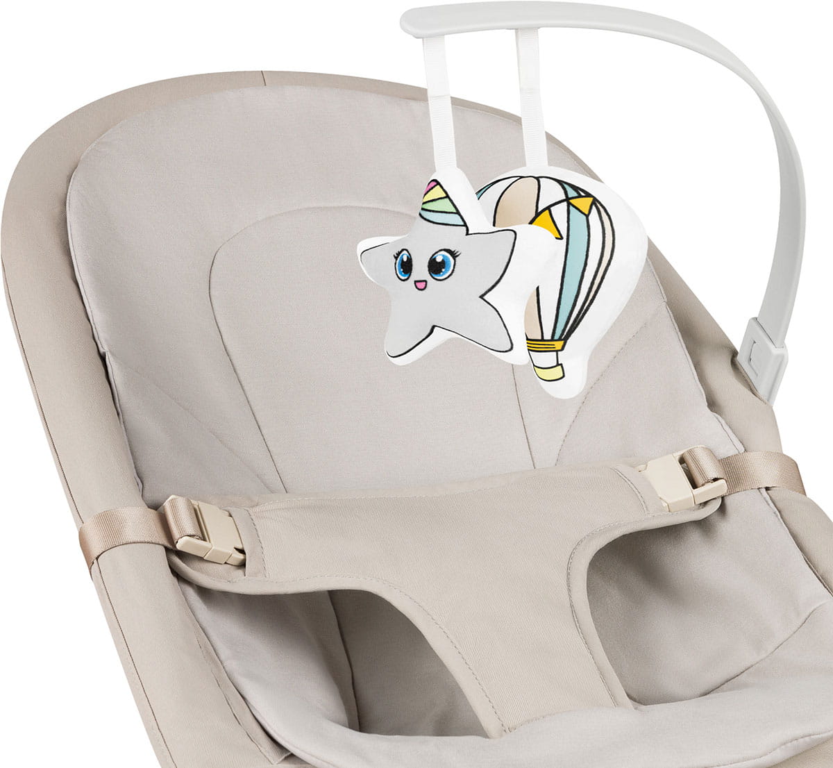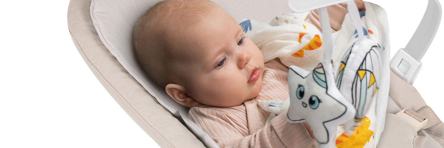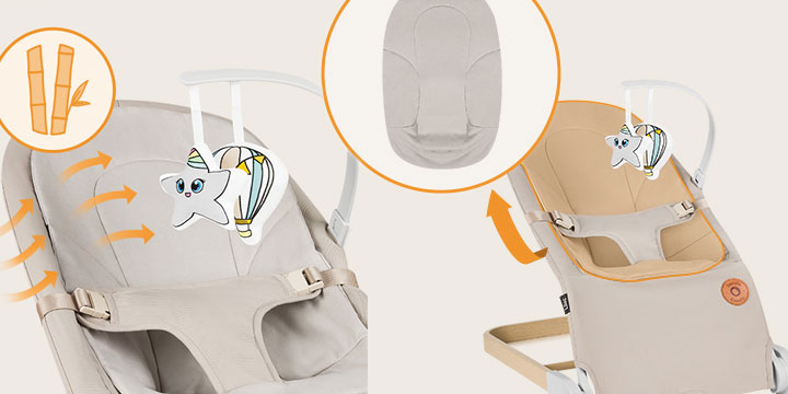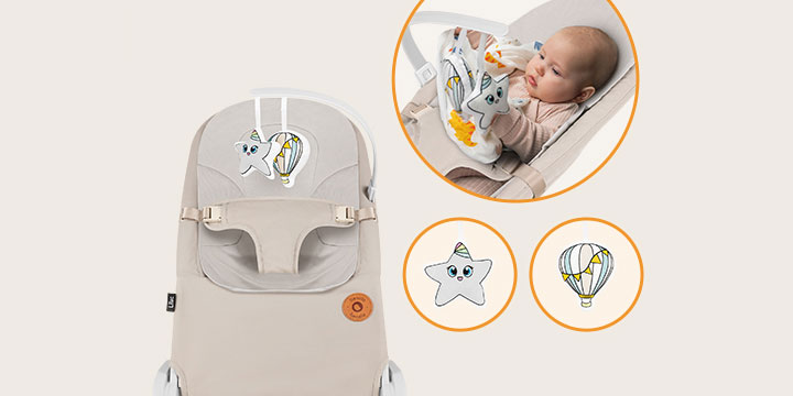 3-punktowe pasy bezpieczeństwa będą trzymać w ryzach nawet bardzo aktywnego maluszka, natomiast odpinany pałąk z miękkimi zabawkami będzie źródłem rozrywki.