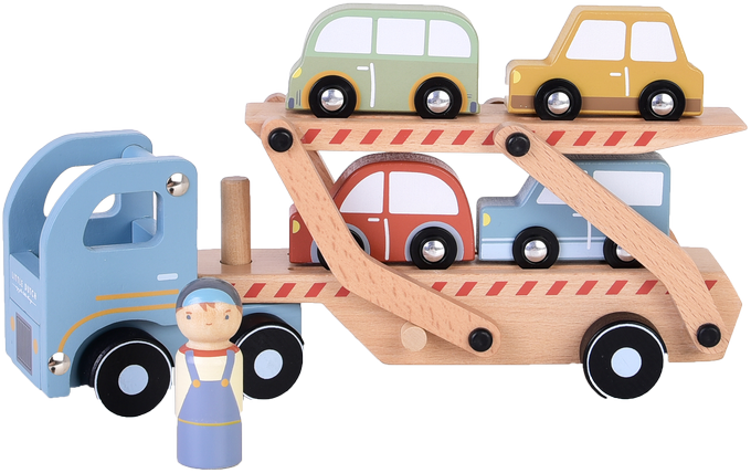 Drewniana laweta z autami FSC Little Dutch. Kłopoty z samochodem na drodze? Dzięki lawecie od Little Dutch to nie problem. Pracowity kierowca szybko pomoże Twojemu dziecku załadować auta i dostarczyć je prosto do warsztatu. Laweta posiada ruchomą, dwupiętrową naczepę, którą można opuszczać, aby samochodziki łatwo opuściły pojazd. W skład zestawu wchodzą: laweta, kierowca, cztery autka. Wszystkie elementy zestawy wykonane są z drewna z certyfikatem FSC i pokryte bezpiecznymi farbami na bazie wody. To fantastyczny prezent dla każdego małego fana motoryzacji, stanowi świetne uzupełnienie dla pozostałych zestawów od Little Dutch.
