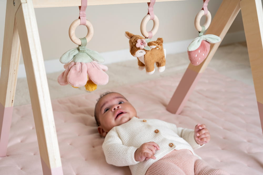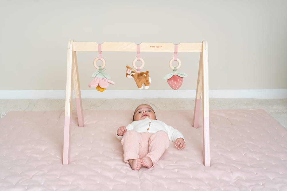 Pałąk interaktywny Fairy Garden od Little Dutch. Drewniany pałąk interaktywny dla niemowląt wzbudza ciekawość maluszka oraz wpływa na jego rozwój ruchowo-poznawczy. Do pałąka dołączono miękkie zawieszki – uroczą sarenkę, kolorowy kwiatek i truskawkę, które zachęcają dzieci do ich dotykania i odkrywania. Można go postawić na dywanie, macie lub podłodze. Świetna, rozwijająca zabawa gwarantowana! Stanowi doskonałe uzupełnienie do pozostałych produktów z kolekcji Fairy Garden. Wspaniały pomysł na prezent.