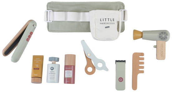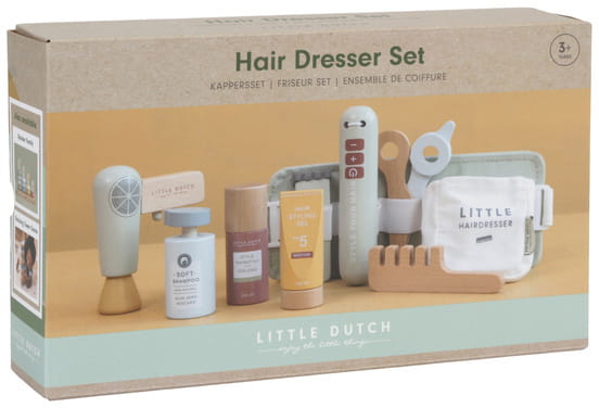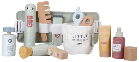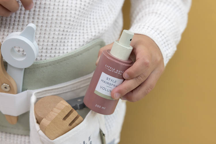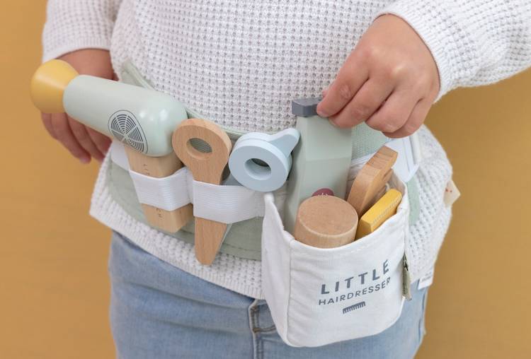 Zestaw fryzjerski FSC od Little Dutch. Zostań profesjonalnym fryzjerem! Zaproś przyjaciół, rodzinę lub lalki do własnego salonu fryzjerskiego. Załóż regulowany pas biodrowy i twórz najpiękniejsze fryzury. Twój maluch będzie się świetnie bawić jako fryzjer. Ten drewniany zestaw akcesoriów fryzjerskich zawiera nożyczki, suszarkę do włosów, prostownicę, maszynki do strzyżenia, grzebień, szampon, lakier do włosów i żel do stylizacji. Świetna zabawa, pobudza wyobraźnię i umiejętność odgrywania ról. Idealnie sprawdzi się jako prezent dla małego stylisty fryzur.