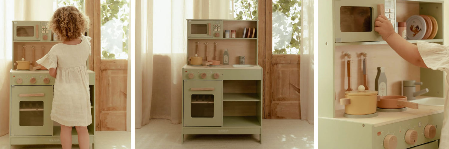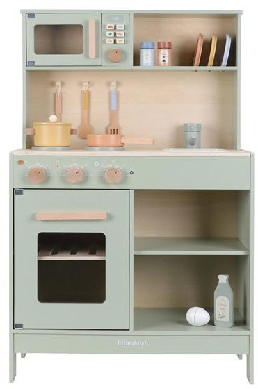 Duża kuchnia pastelowa Little Dutch to prawdziwe królestwo zabawy dla małych kucharzy i kucharek. Wykonana z solidnego drewna bukowego z certyfikatem FSC, zachwyca starannym wykończeniem i pastelową kolorystyką z dominującym, miętowym odcieniem. To idealna propozycja zarówno dla dziewczynek, jak i chłopców.