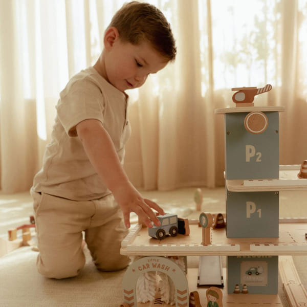 Garaż wielopoziomowy Little Dutch to prawdziwe centrum motoryzacyjnych przygód! Podnośnik samochodowy pozwala wygodnie transportować auta między poziomami, a specjalny lądowisko czeka na helikopter. Na parkingu jest miejsce dla wielu pojazdów, a dodatkowe elementy - takie jak myjnia, stacja benzynowa, znaki i figurki - sprawiają, że zabawa staje się jeszcze bardziej realistyczna.