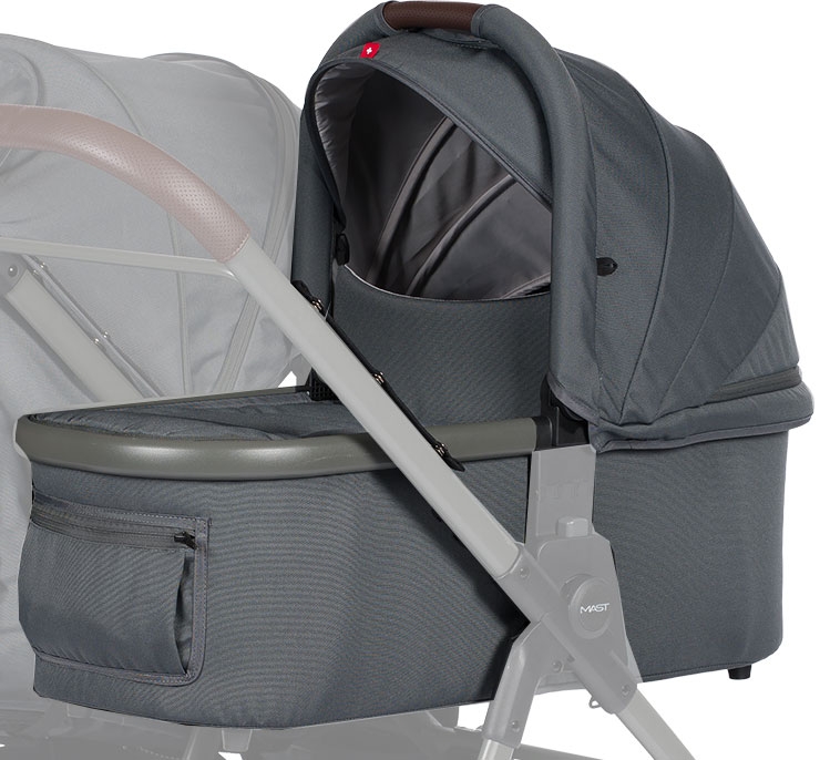 Gondola do wózka Mast Swiss Design M-Twin X. Jest wygodna w montażu, można jej używać zarówno podczas używania wózka w trybie wózka dla bliźniąt, jak i dla rodzeństwa rok po roku. Materiał zewnętrzny jest bardzo wytrzymały, natomiast wnętrze gondoli jest niczym kokon - miękkie, ciepłe i przytulne.