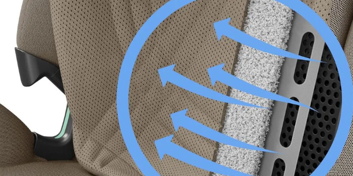 Specjalne panele wentylacyjne, oddychająca pianka i siateczkowe tkaniny dbają o idealną cyrkulację powietrza, zapobiegając przegrzewaniu się dziecka o każdej porze roku.