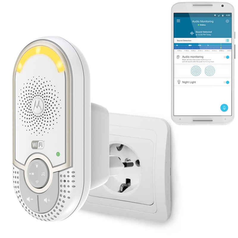 Inteligentna elektroniczna niania audio Motorola MBP162 Connect wyposażona w łączność Wi-Fi i lampkę nocną. Wygodna w użyciu w domu i poza nim konstrukcja wpinana w gniazdo elektryczne, bezprzewodowa łączność z kompatybilnym urządzeniem z zainstalowaną aplikacją, dwukierunkowa łączność to podstawowe zalety ten nowoczesnej i łatwej w użyciu niani elektronicznej.