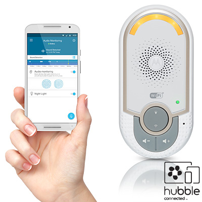 Elektroniczna niania Motorola MBP 162 Connected wyposażona w bezprzewodową komunikację Wi-Fi - połączenie z aplikacją Hubble umożliwia nasłuch, rejestrowanie dźwięków, włączenie lampki nocnej.