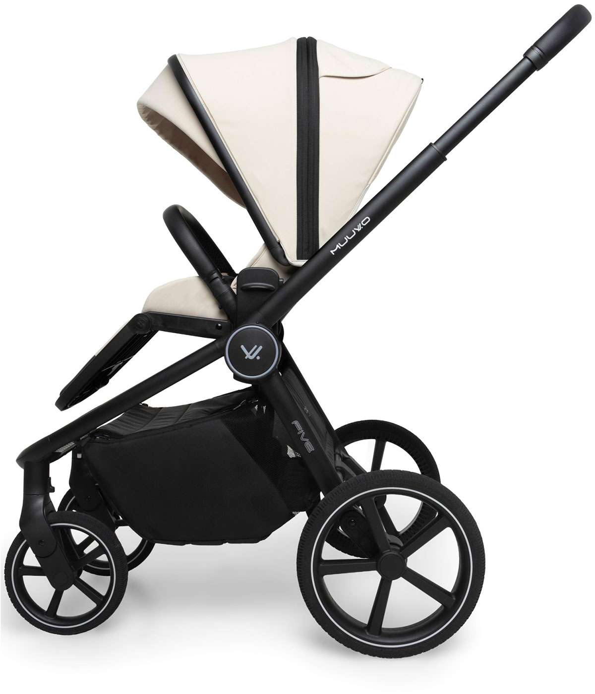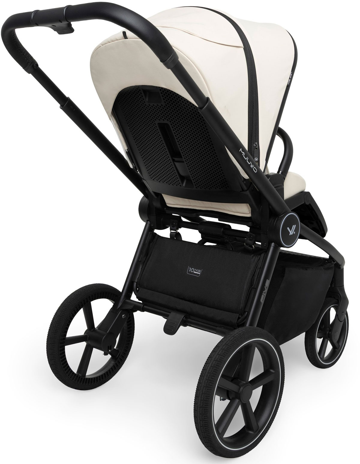 Wózek Muuvo Five posiada obszerną gondolę, której dno zostało wzmocnione pianką EPP, a siedzisko spacerowe można wpiąć zarówno przodem, jak i tyłem do rodzica.