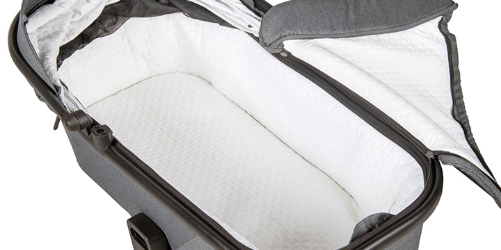Gondola została wyposażona w wystarczająco gruby, wygodny materac, który wspiera ułożenie w poprawnej pozycji leżącej - dzięki temu kręgosłup maluszka nie jest narażony na podróżowanie w wymuszonej, niezdrowej pozycji, co wpływa na jego prawidłowy rozwój. Cicha regulacja budki to coś, za co podziękujesz po długim procesie usypiania malucha - nie zbudzisz go podczas jej podnoszenia lub obniżania.