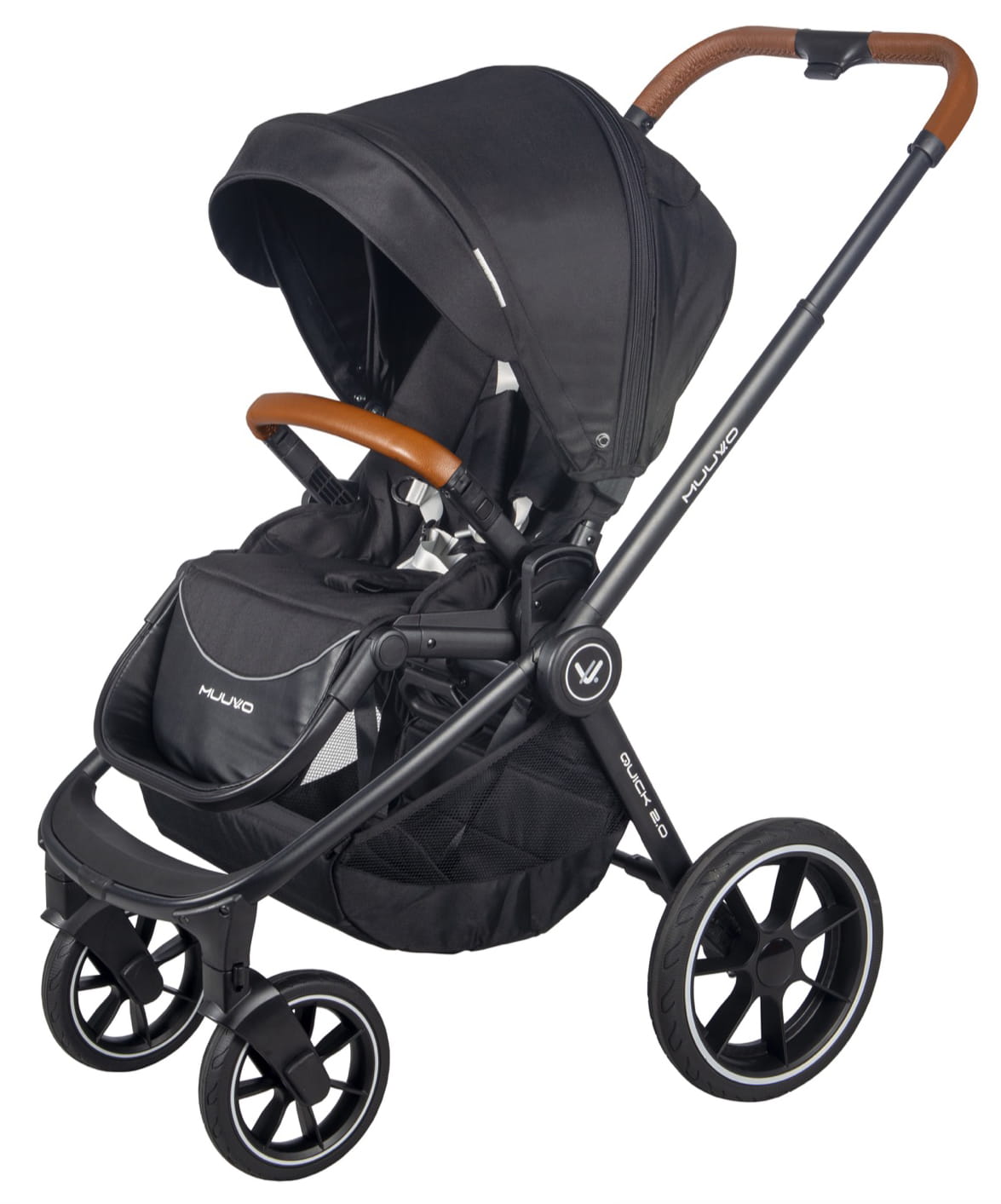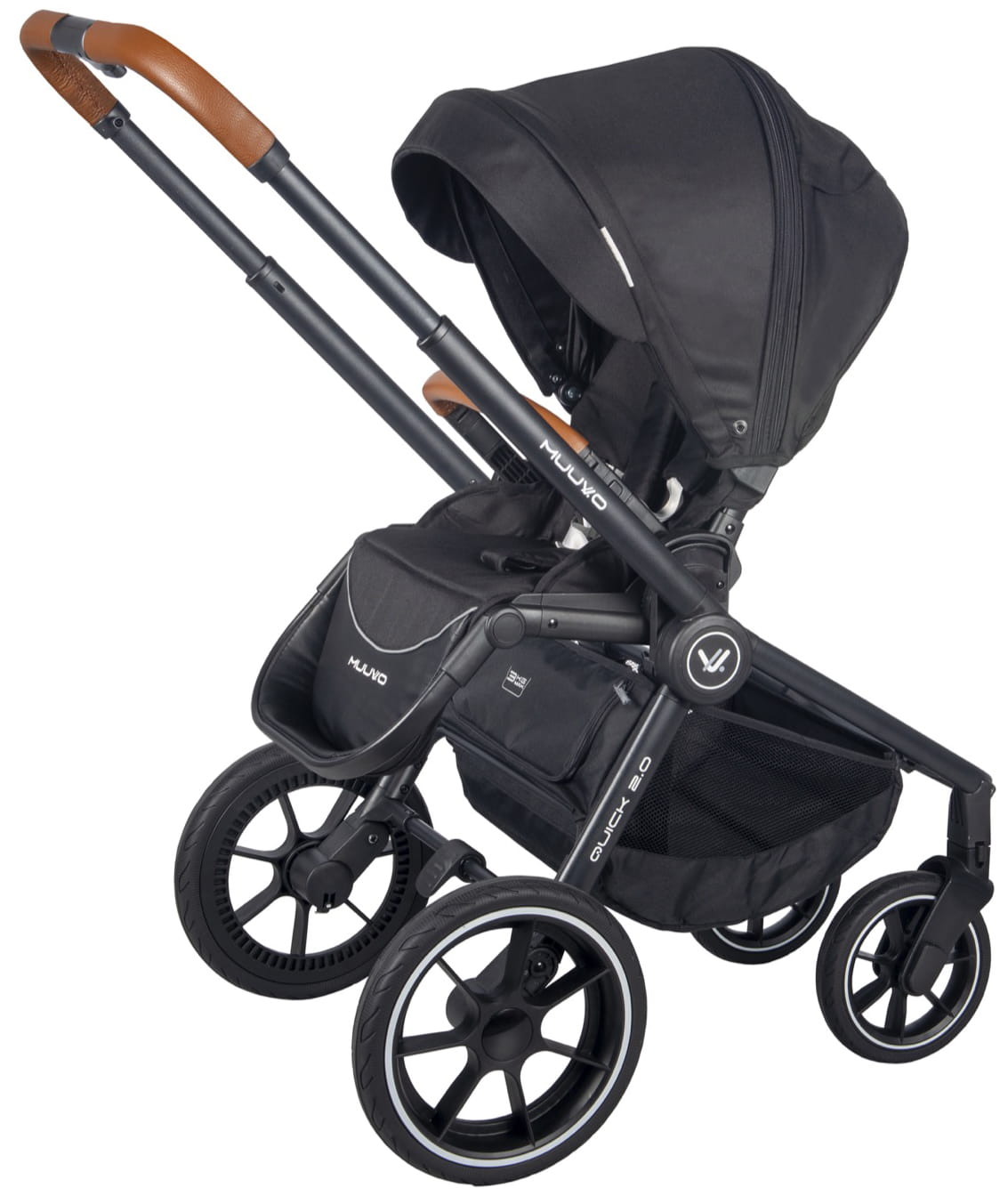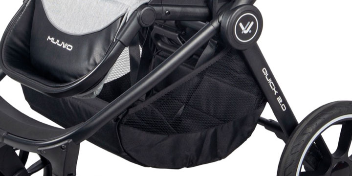 Muuvo Quick 2.0 został udoskonalony - posiada duże, bieżnikowane i bezobsługowe koła, kosz z łatwiejszym dostępem, wytłoczone logo na ramie wózka i poprawione mocowanie torby. Jest niezwykle elastyczny, poprzez regulację parcia do pozycji leżącej oraz podnóżka, który zwiększa przestrzeń dla dziecka podczas snu.