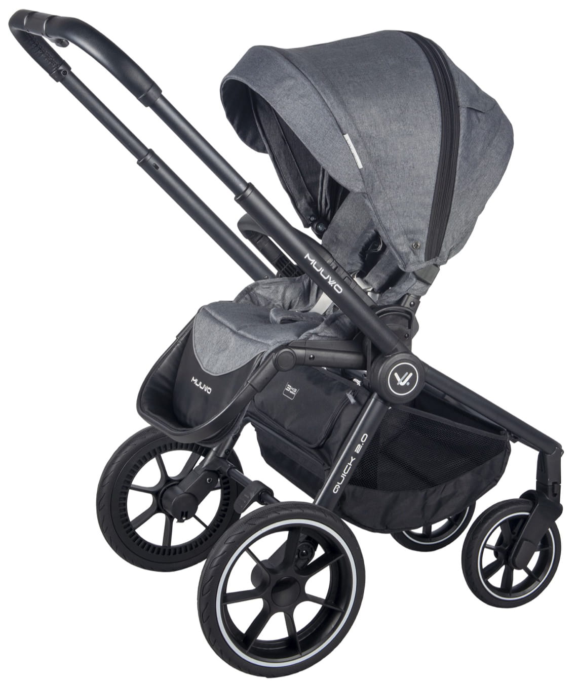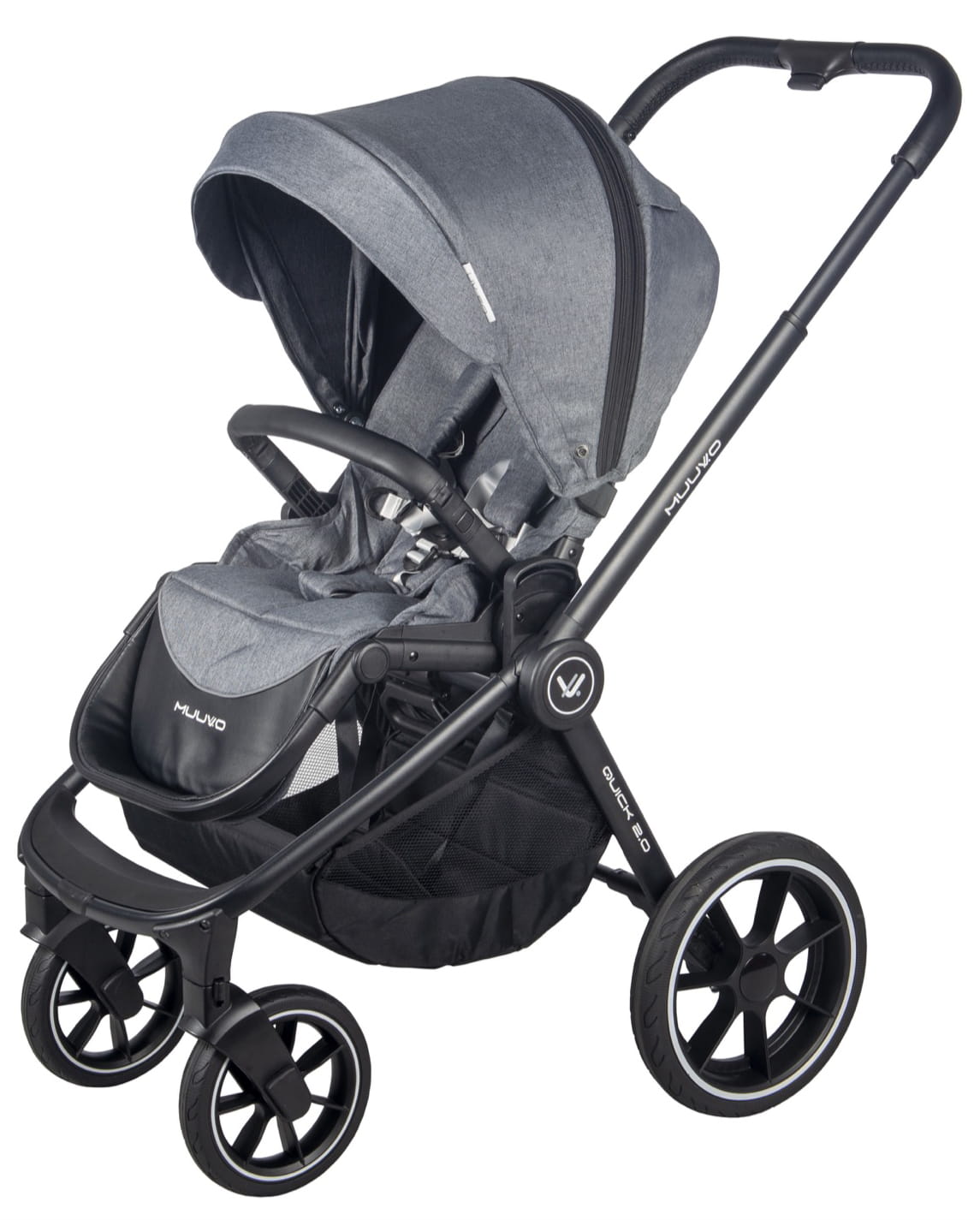 Muuvo Quick 2.0 został udoskonalony - posiada duże, bieżnikowane i bezobsługowe koła, kosz z łatwiejszym dostępem, wytłoczone logo na ramie wózka i poprawione mocowanie torby. Jest niezwykle elastyczny, poprzez regulację parcia do pozycji leżącej oraz podnóżka, który zwiększa przestrzeń dla dziecka podczas snu.