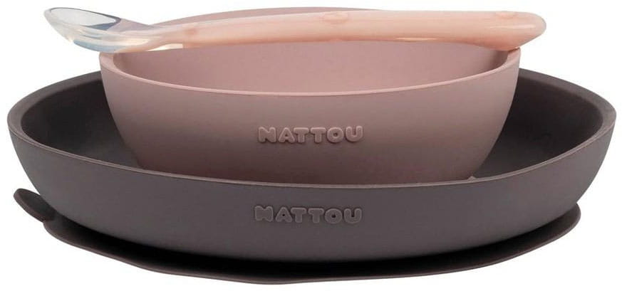 Nattou silikonowe naczynia dla dzieci, zestaw 3w1 z łyżeczką | Fioletowo-Różowy