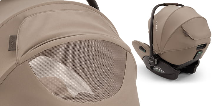 Zdejmowana, pełna budka z filtrem UPF 50+ wyposażona w odchylaną osłonę na oczy oraz siateczkowe okienko peek-a-boo dla lepszej wentylacji i podglądu dziecka.