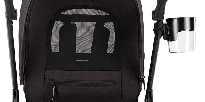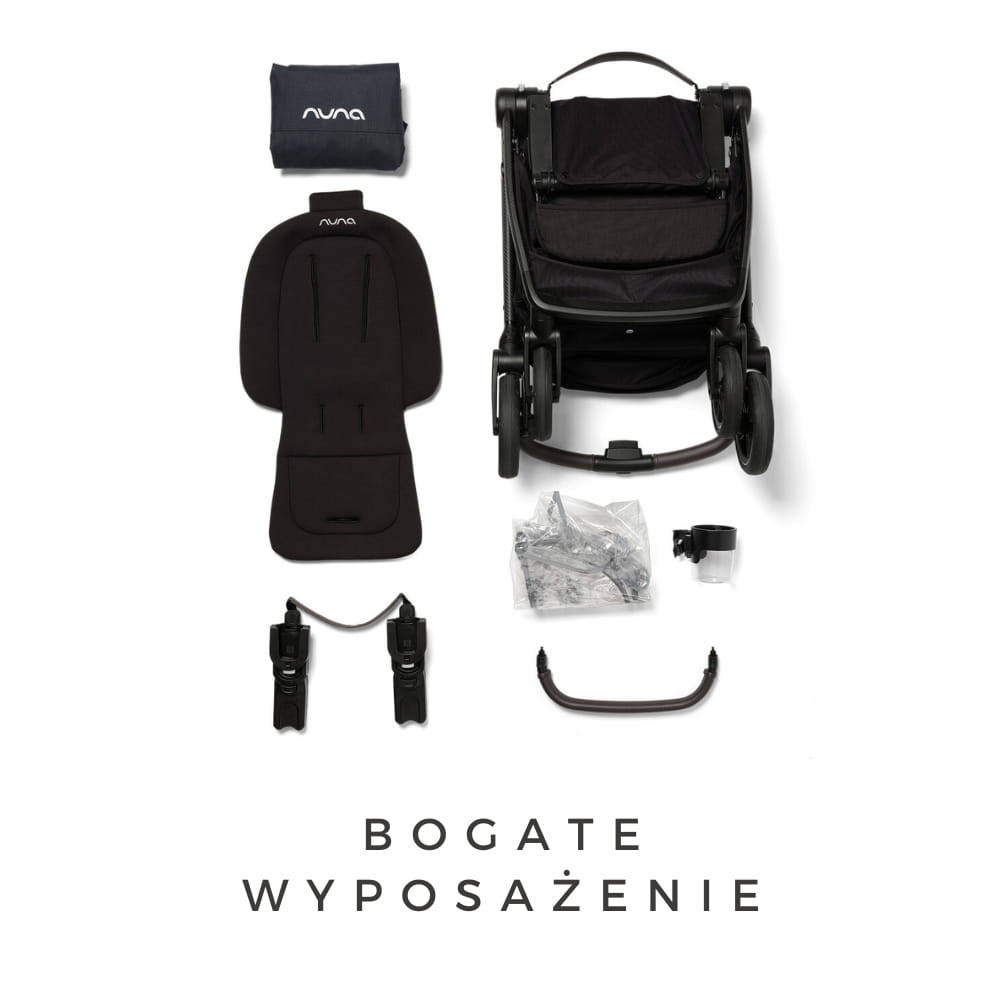 W zestawie znajduje się uchwyt na kubek, folia przeciwdeszczowa, torba transportowa oraz adaptery do fotelika samochodowego, co czyni go kompletnym rozwiązaniem na każdy spacer.